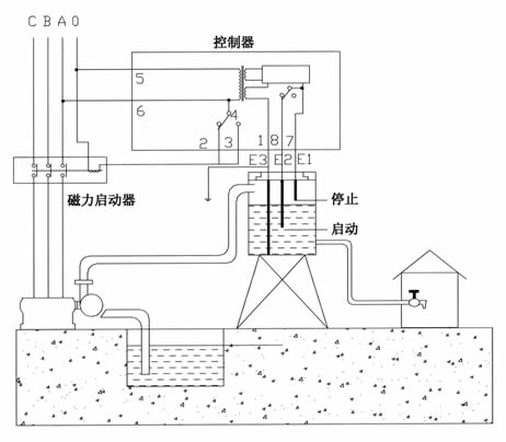 當液位升到E1時,E1、E2、E3電極經液體導通,此時控制回路E1與E2在控制器內相接,②、④接點由常閉轉為常開,電磁開關失電,水泵停止,同時由于E1、E2相接致使繼電器自鎖,此后液位下降,同時指示燈轉換為紅燈亮。